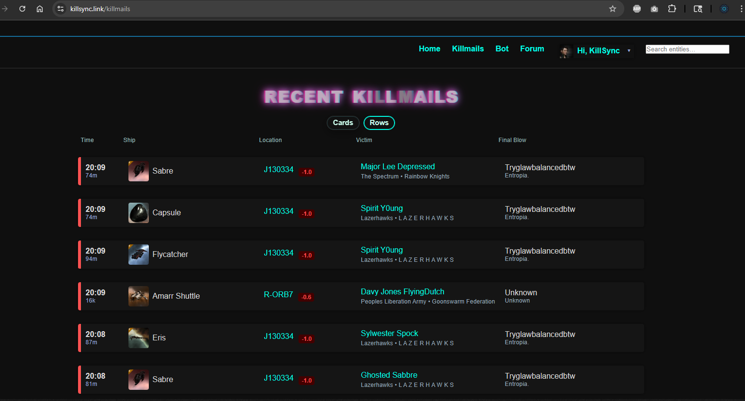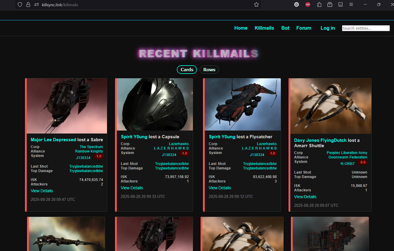 You can now switch the Killmails page between Cards (visual) and Rows (compact). Use the toggle at the top; your preference is saved for next time.